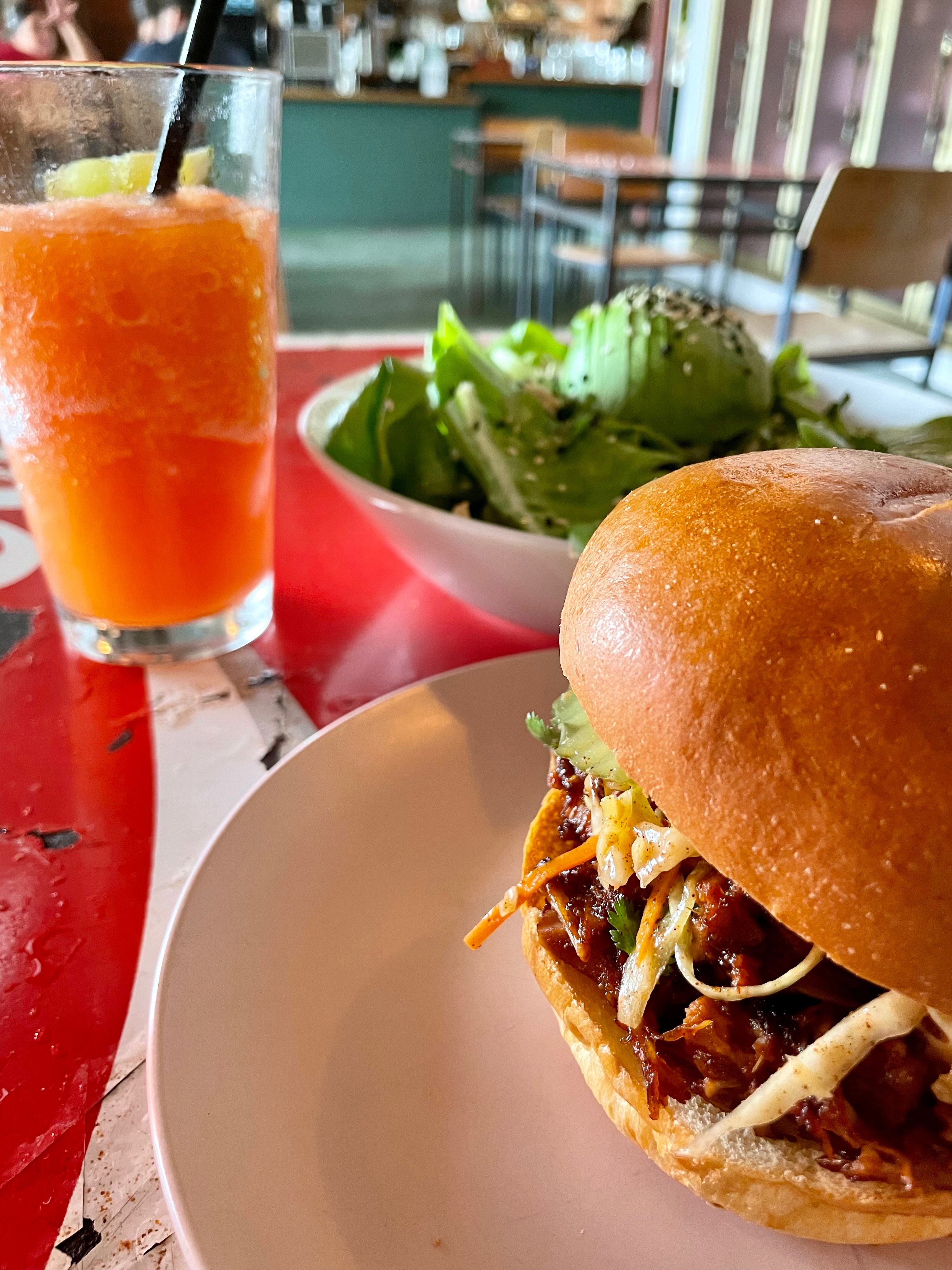 We came to Kinda Tropical for a thrift market which was so fun! I got the mango marg and then the pina colada to drink. Definitely get the large, the small is pretty small. You walk up to a counter to